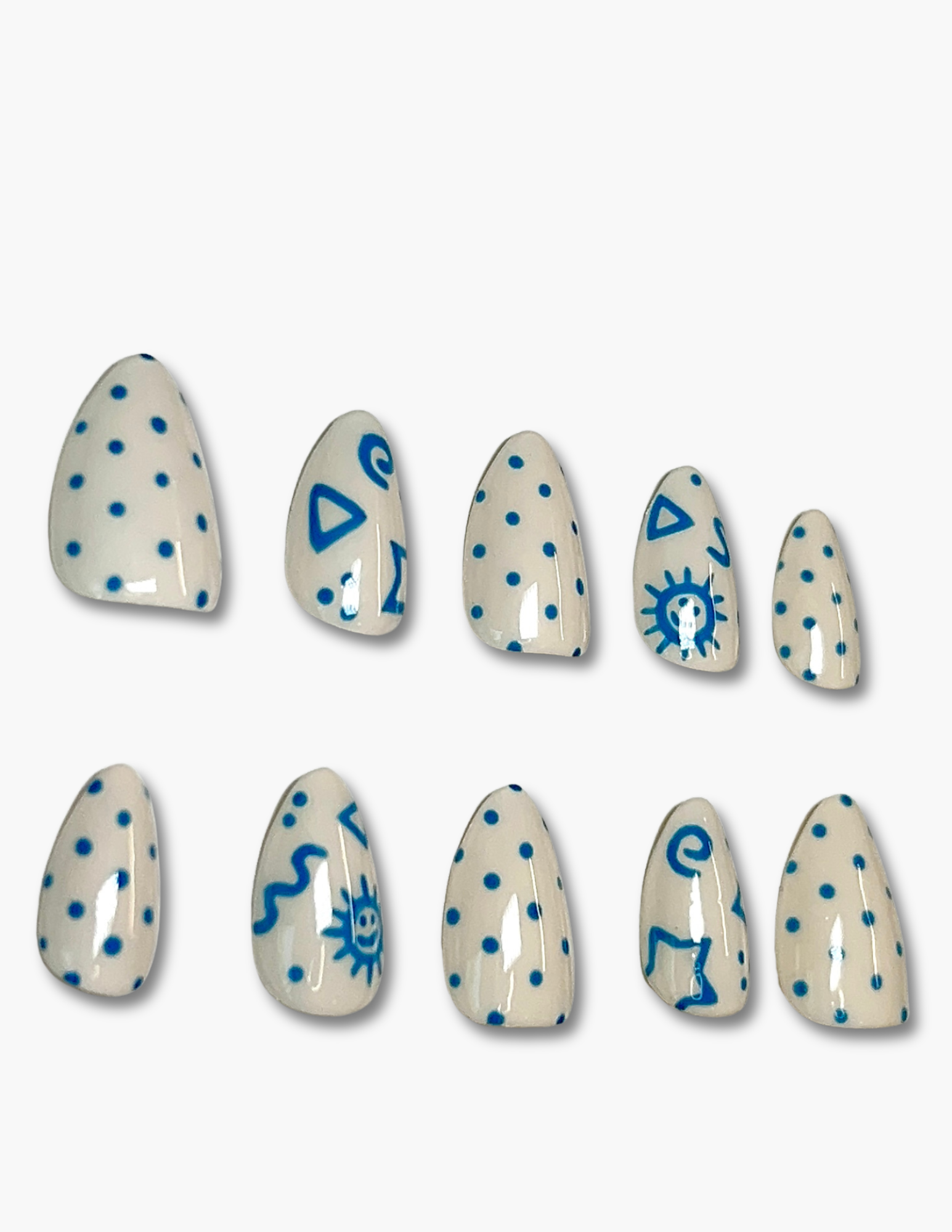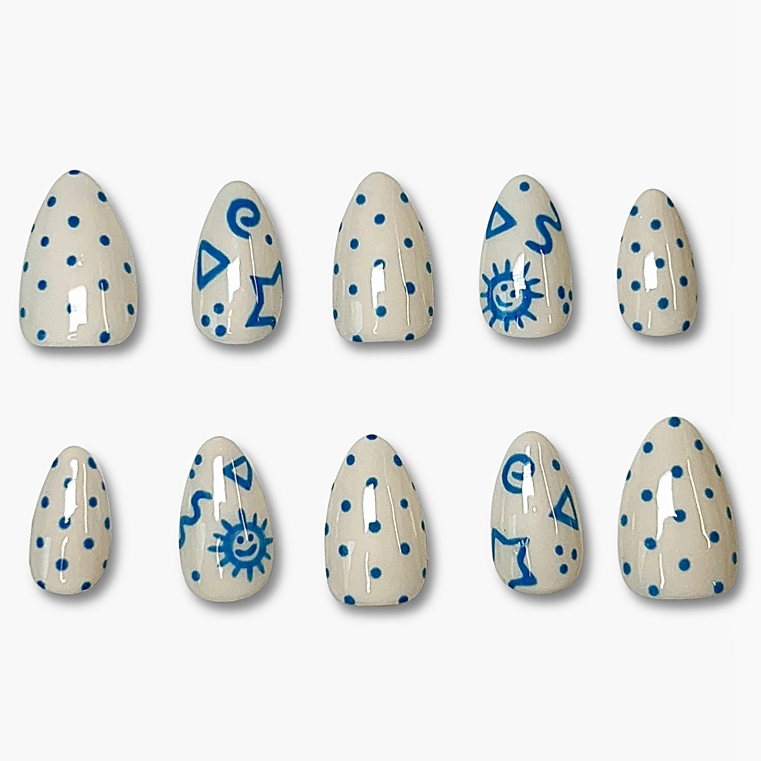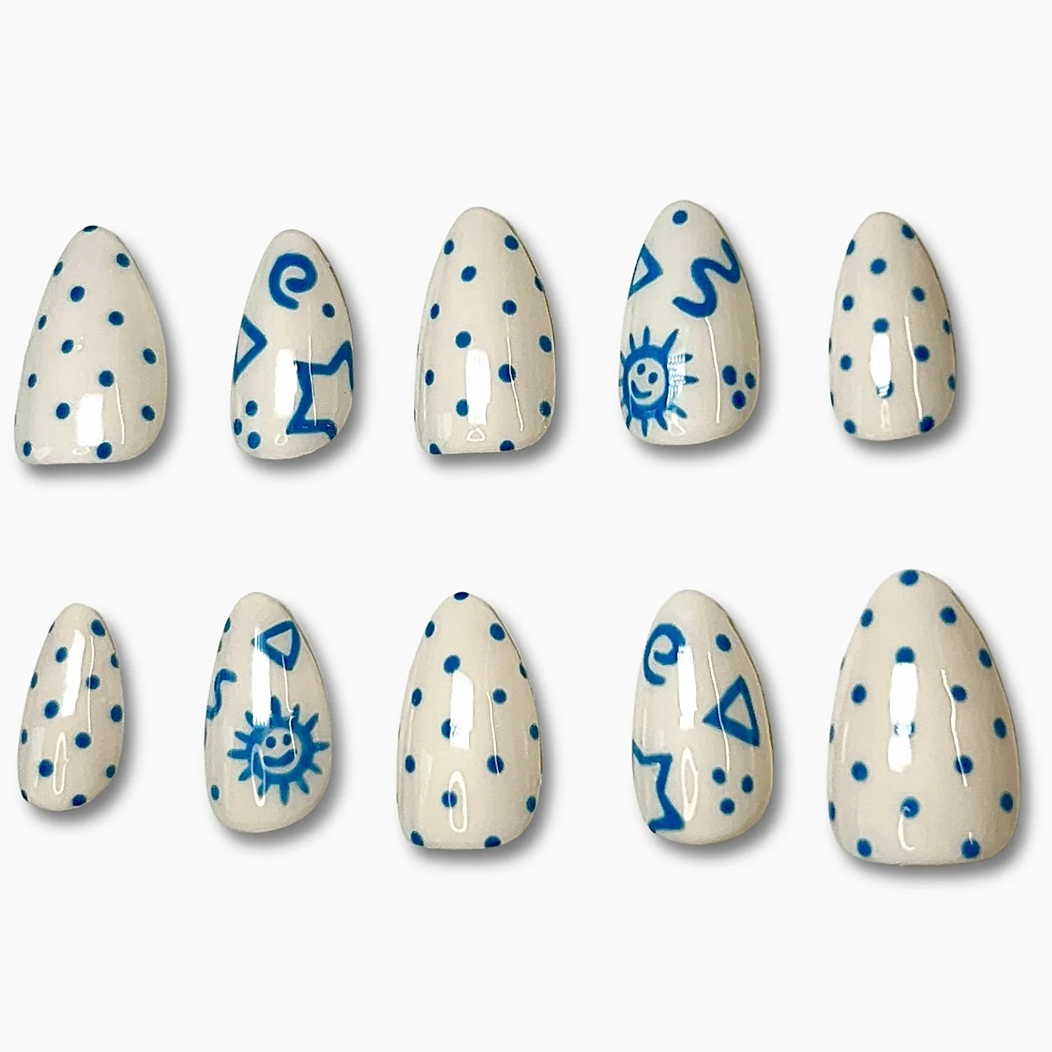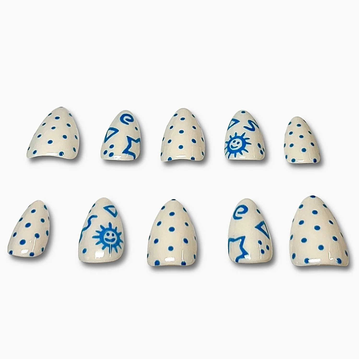 Playful, bright, and full of personality, Crayon Club features a soft cream base adorned with cheerful blue polka-dot accents and kid-inspired geometric designs. The result is a fun, nostalgic look that feels both whimsical and stylish, like a favorite childhood pattern reimagined for your fingertips. Perfect for adding a touch of charm and creativity to any outfit, Crayon Club brings a lighthearted statement with an artsy, handmade feel. 🖍️💙