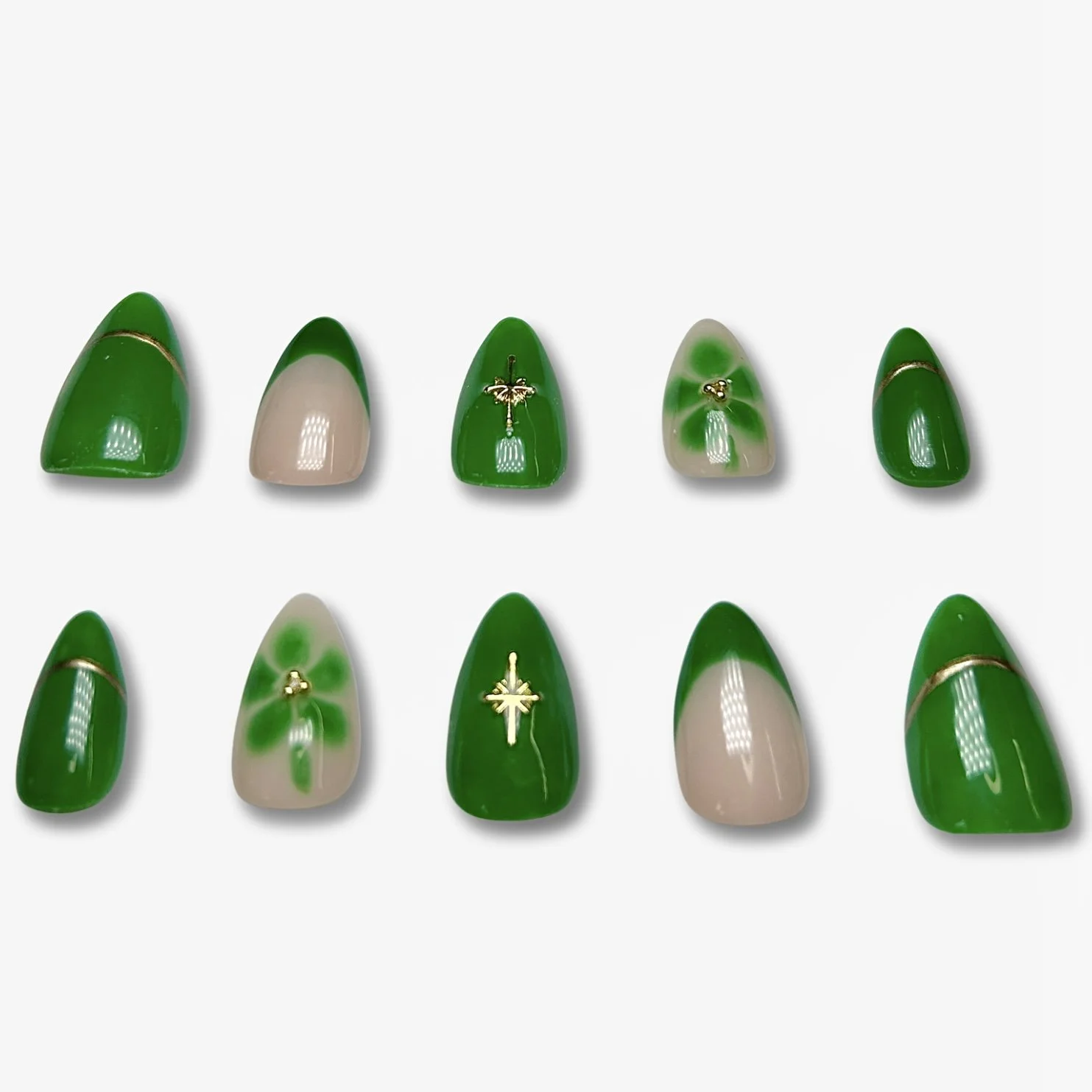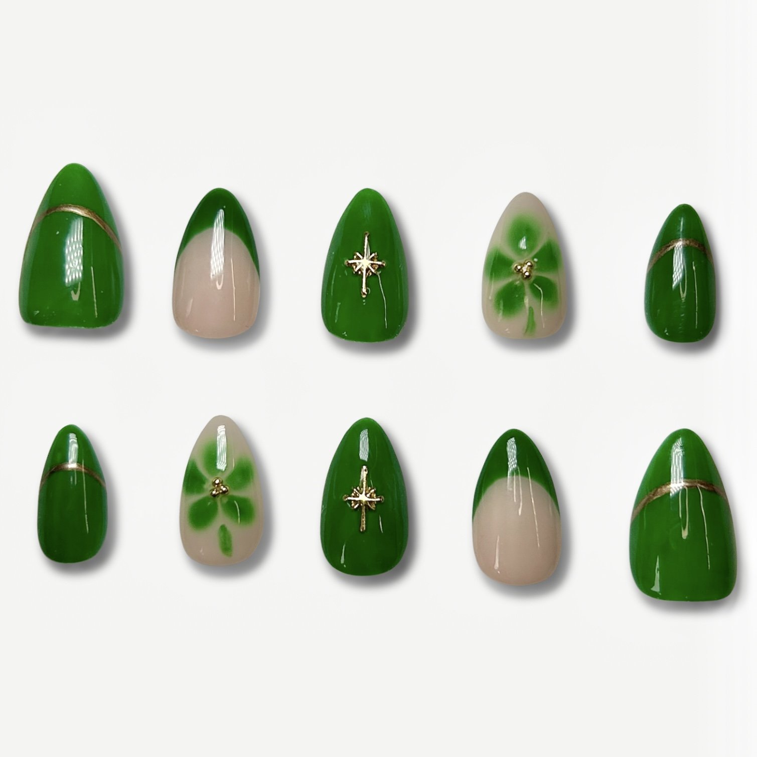 Bring a little luck and luxury to your fingertips with Gilded Clover. This elegant set features rich kelly green tones paired with delicate clover accents and shimmering gold details. The bold green base evokes lush fields of clover, while metallic gold touches add a refined, eye-catching glow.