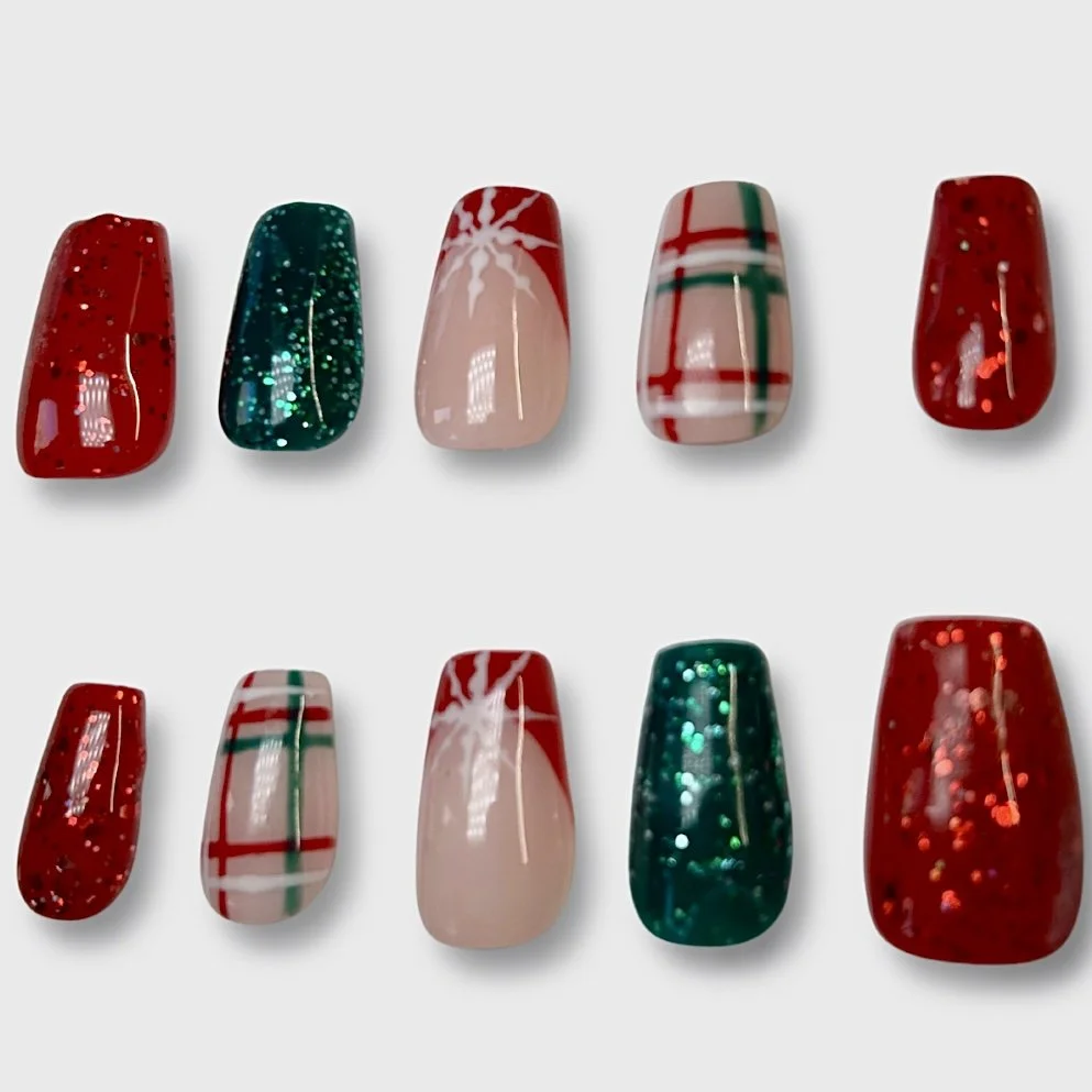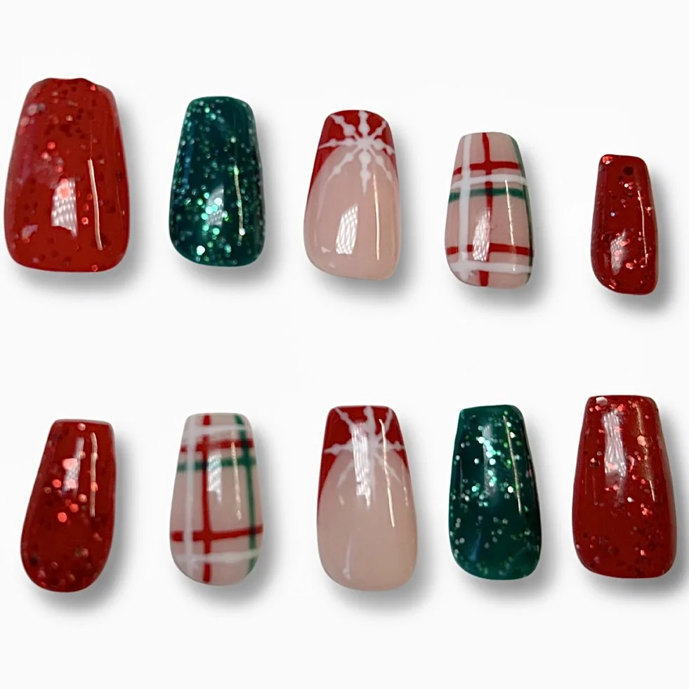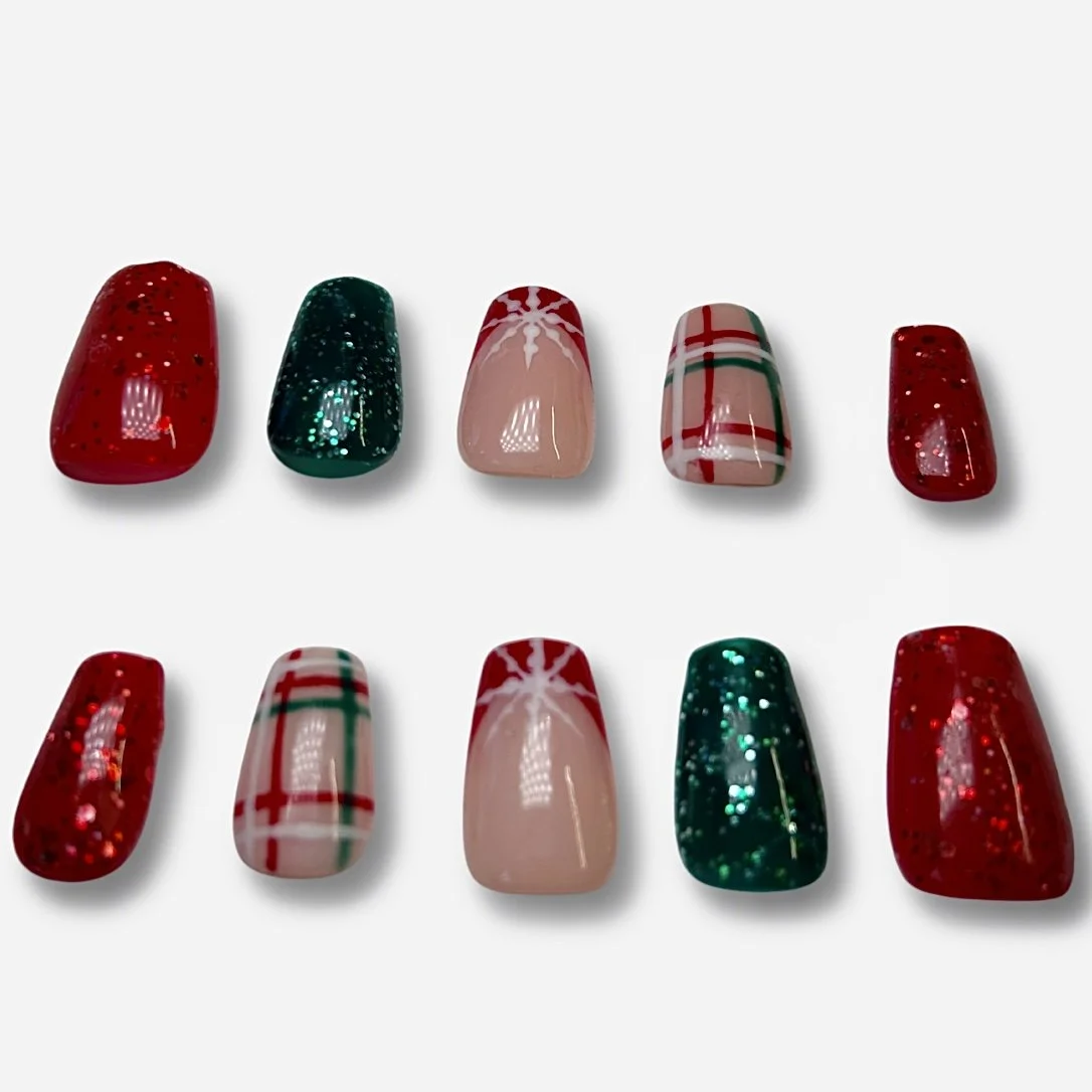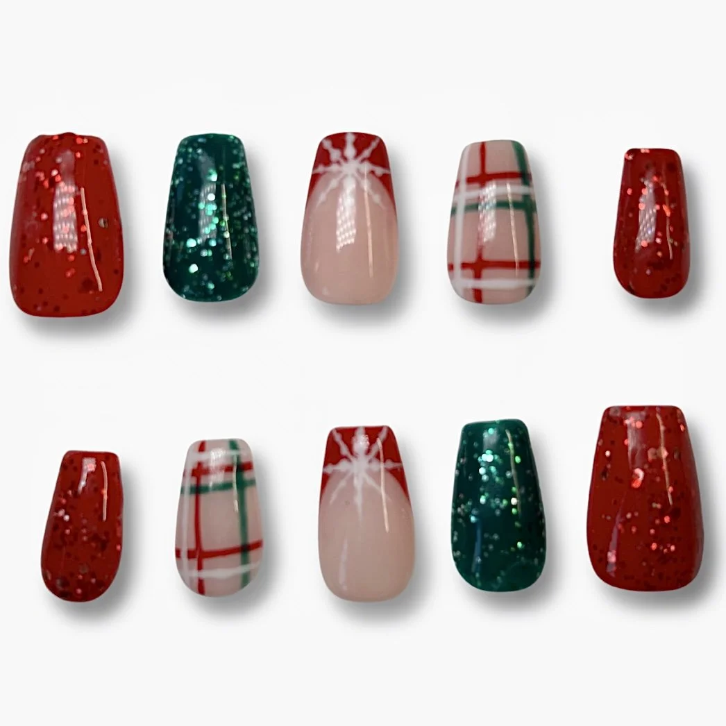 Wrap your nails in the warm, nostalgic charm of the season with Festive Flannel. This press-on nail set blends deep forest green, rich holiday red, and a perfectly crisp flannel pattern for a look that’s equal parts cozy and chic.